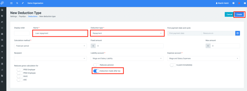 Go to the Payslips in Settings, choose Deductions, and click New Deduction Type.